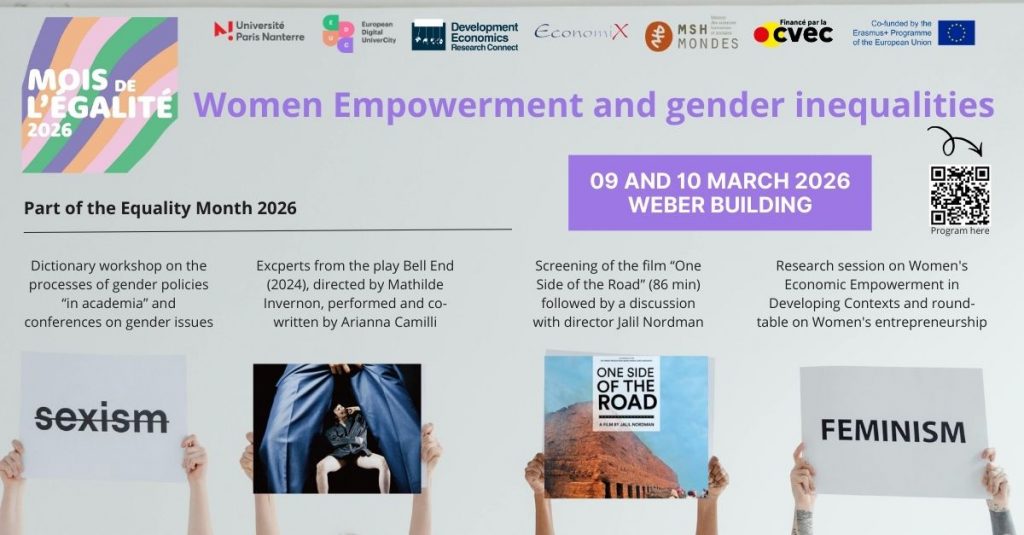 As part of the Equality Month, the Center for Equality and Non-Discrimination (CCEND), the EDUC alliance, the DEV-Connect network, and EconomiX at University Paris Nanterre are organizing a two-day workshop on women’s empowerment and gender inequality on March 9 to 10, 2026. To attend online this event follow this link to register. The deadline is March 5, 2026.
